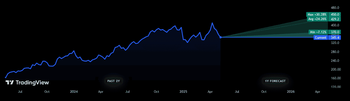 As the graph shows, the 11 analysts with ratings on the stock are united in their optimism. One especially bullish forecaster expects the retailer to march to new multi-year highs of 450p.