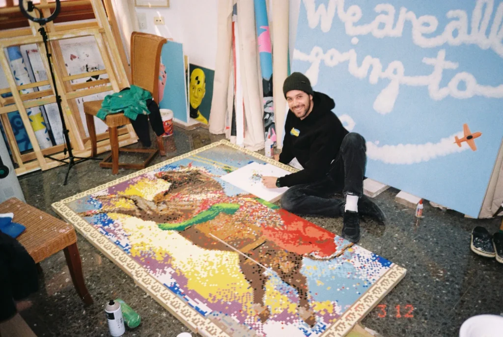 Spanish artist Luis Simo is known for producing some of the most ambitious and visually commanding works for the Bitcoin Conference art gallery. At B23 Miami, his multi-panel mural Pepernica reimagined Picasso’s Guernica through the lens of Rare Pepe iconography—fusing historical gravity with meme-driven absurdity. As a centerpiece of the exhibition, Pepernica mirrored the ideological battleground Bitcoin faced at the time, turning satire into political commentary at monumental scale. For B25, Simo returns with KEKIUS MAXIMUS, a monumental pixel mosaic composed of over 30,000 hand-placed resin tiles. Styled after an ancient Greco-Roman floor piece, it depicts the meme-god Kekius Maximus riding a mystical bull, his Bitcoin-woven cape billowing as storm clouds part to reveal radiant light. At 78 x 59 inches, the work serves as both a shrine to meme culture and a maximalist gesture toward Bitcoin’s mythic potential.