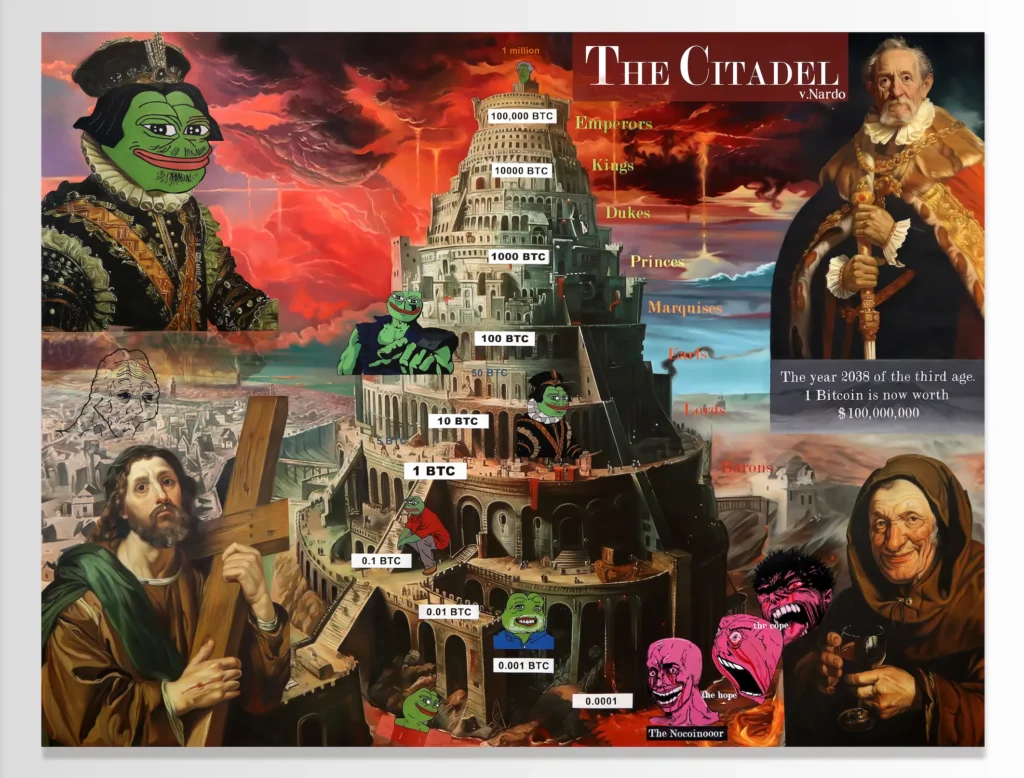 X-NARDO: Yes, but only in the sense that every era’s greatest art holds a mirror to its dominant mythologies. The Citadel is not merely an artwork, it is a reckoning. It confronts the viewer with their position on a speculative hierarchy that feels both prophetic and surreal. It is a world where Bitcoin has reshaped not just markets, but meaning itself. Hand-painted in oil yet built like a multi-layered Photoshop file, it drags the digital detritus of 4chan or Reddit meme aesthetics into the studio, and suspends it in a composition not unlike the chaotic allegories of Bosch or the vertical wealth narratives commissioned by the Medici. In this sense, it is the Bitcoin era’s Garden of Earthly Delights – a dream, a warning, a satire, and a prayer, all at once. It is also a deeply personal work, a response to the anonymous 2013 Reddit post from the so-called Bitcoin Time Traveler, a post that, like myth, cannot be proven but continues to abstractly unfold.