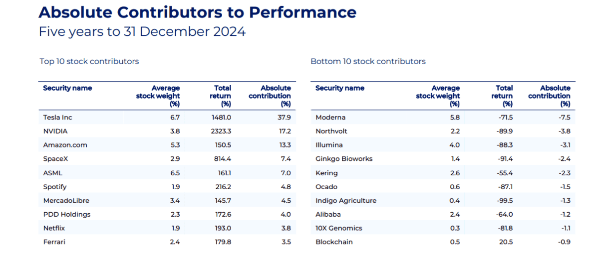 As can also be seen though, the laggards are easily offset by massive winners. For example, Nvidia had gained 2,323% in the five years to the end of 2024. Private holding SpaceX was up more than 800%!
