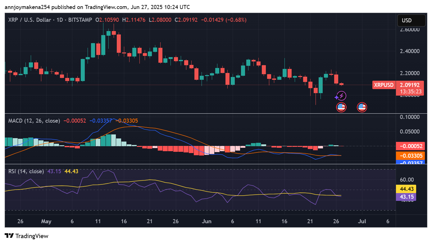 XRP is currently trading at $2.09, down nearly 4% over 24 hours and 3.64% weekly as of Friday, 27th July. Despite the dip, daily trading volume surged by 28.37% to $3.32 billion, lifting the volume-to-market cap ratio to 2.69%.
