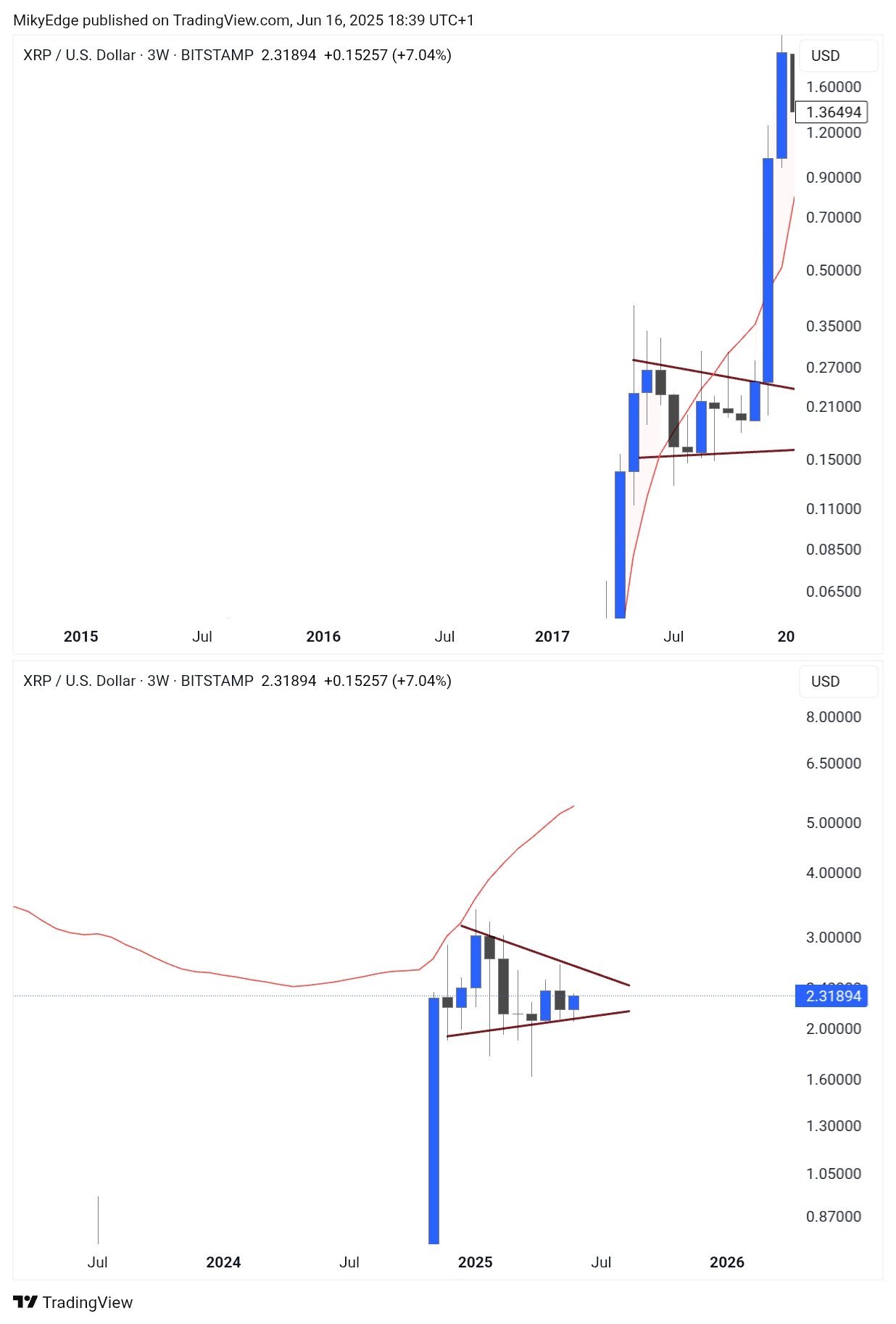 YouTuber DustyBC Crypto referred to XRP as incredibly cheap, below $2, and advised long-term holders to save at current prices. Another commentator, Mikybull Crypto, proposed the breakout of a larger symmetrical triangle, which would lead to an extended rally of historical XRP price levels as in 2017, with the target set at $14. He noted, “I HAVE SEEN THIS MOVIE BEFORE 2017 UPCOMING RALLY VIBES.”