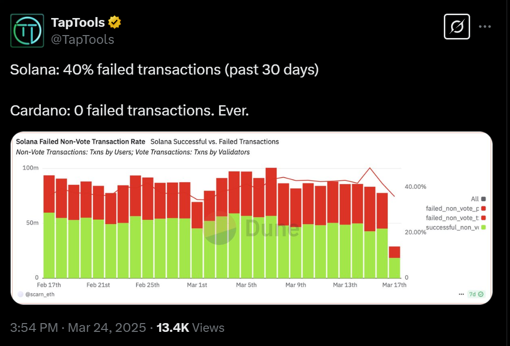 Citing data from Dune Analytics, TapTools reported a 40% failure rate on Solana transactions in the 30 days leading into March 17. In contrast, the post claims that “every transaction is validated before hitting the chain” on Cardano’s “eUTXO model.”