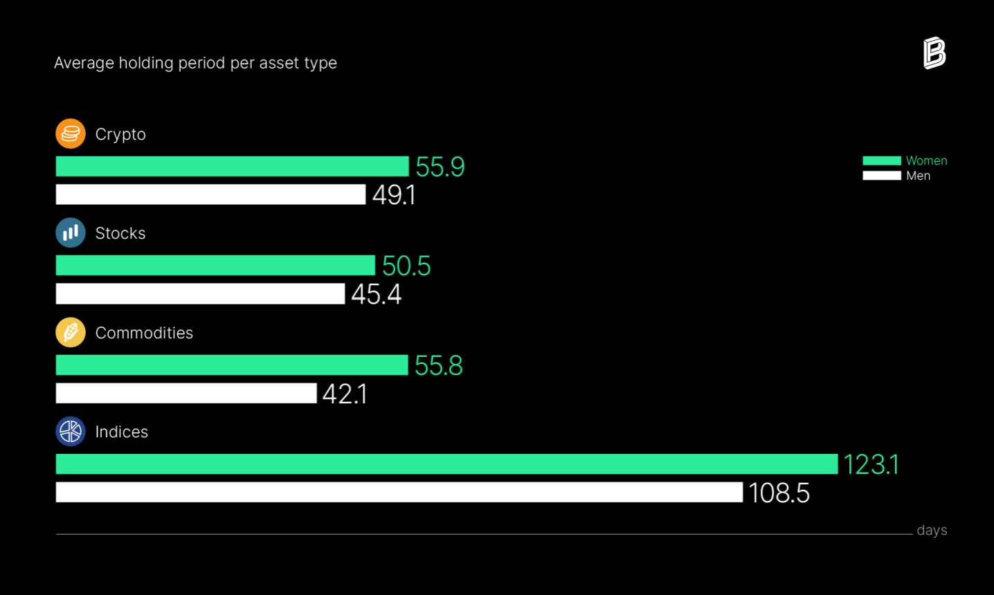 Women and men’s average holding period per asset type Source: Bitpanda