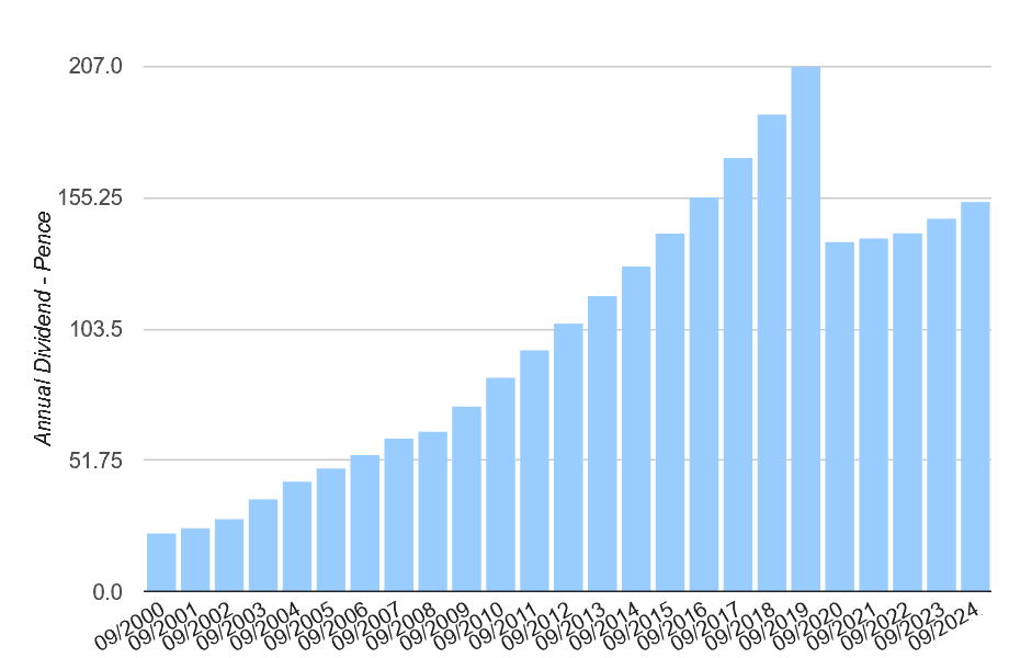 As you can see, this FTSE 100 operator has lifted dividends every year since the turn of the century, except for in 2020 when payouts fell. Dividends plummeted by a third, as pandemic uncertainty accelerated the firm’s debt-cutting plans.