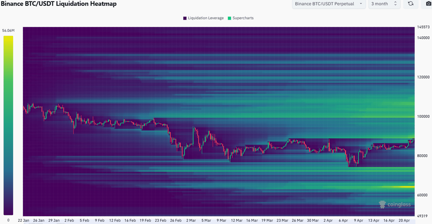 The 3-month liquidation heatmap of Bitcoin indicated that the recent rally could see a bearish reversal at $89.2k-$91k. The price generally gravitates toward liquidity.