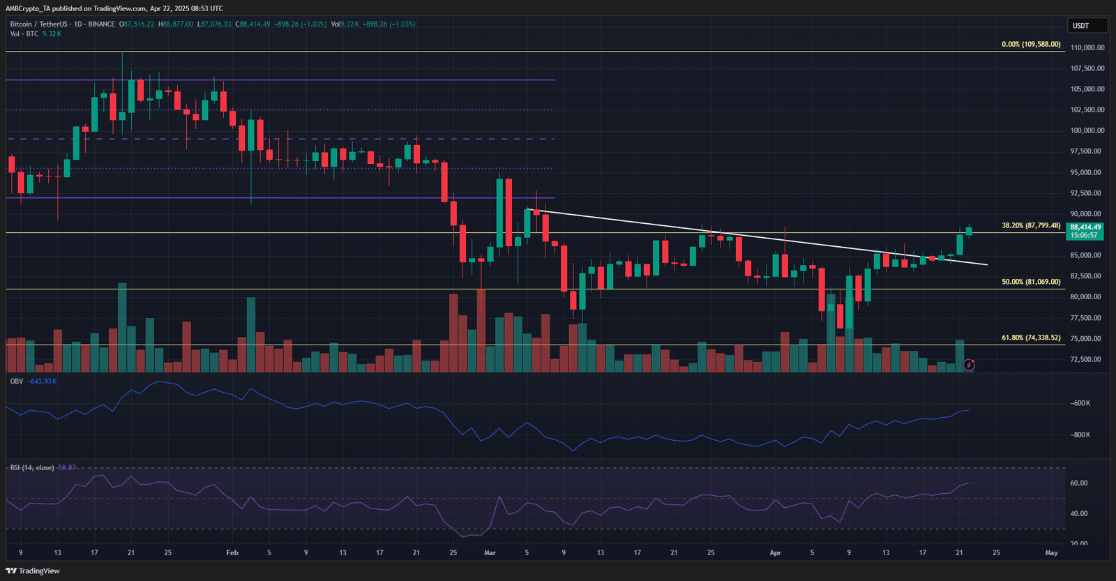 A daily session close above $87.5k would flip the BTC swing structure bullishly, signaling a long-term uptrend was possible. The RSI was at 59, showing that bullish momentum was building.