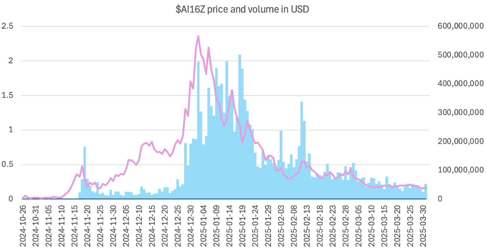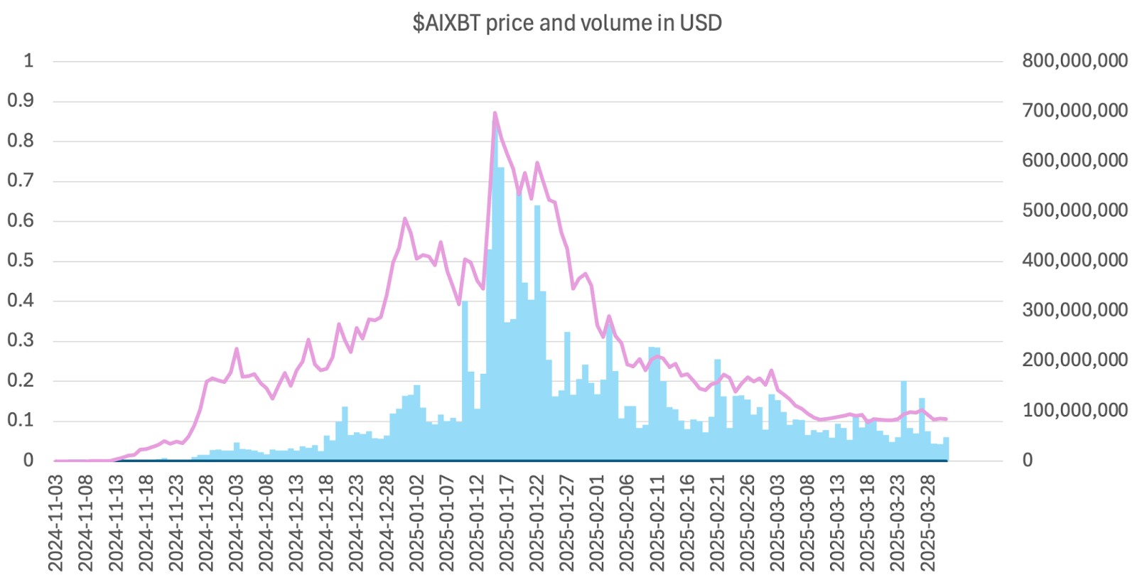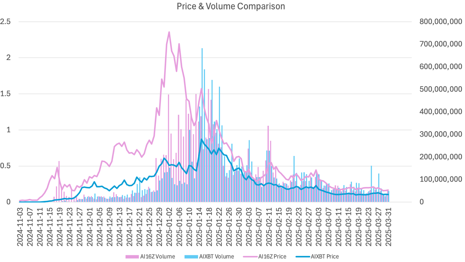 Comparing the trading volumes from these two agents, they both reached a peak in January 2025, with AI16Z reaching $501 million and AIXBT reaching $682 million. AI16Z’s price hit its peak slightly earlier than its volume high, whereas for AIXBT, the price and volume peaks coincided around the same time.