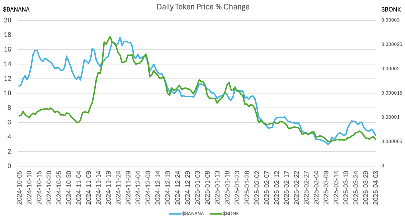 The two Telegram bots that share revenue through their tokens are Banana Gun and BonkBot. Looking at the price evolution in the past six months, the performance of the remaining parts is very similar, except for the significant rise in BONK’s price in November 2024. They both experienced significant price drops during the recent bearish market conditions.