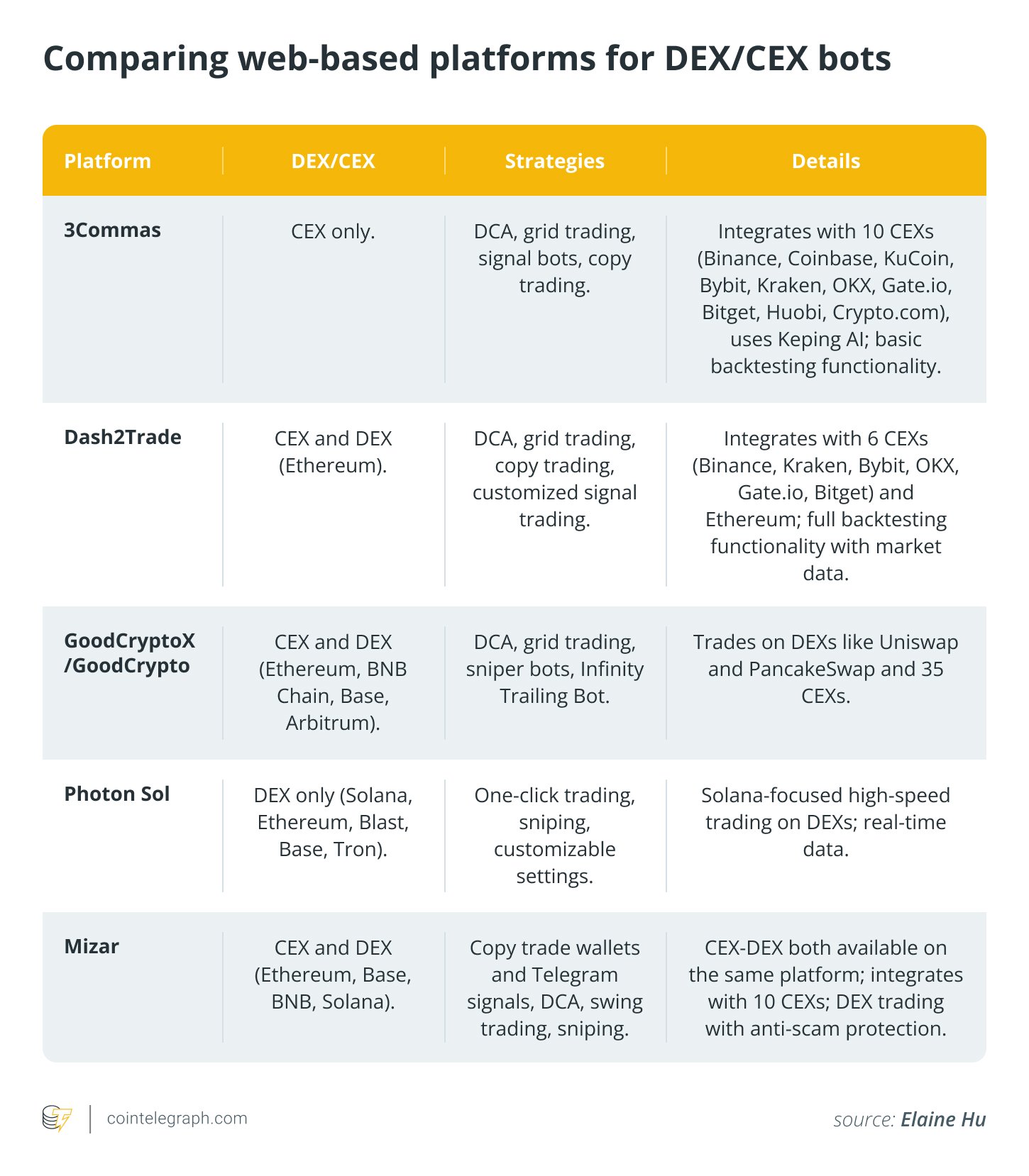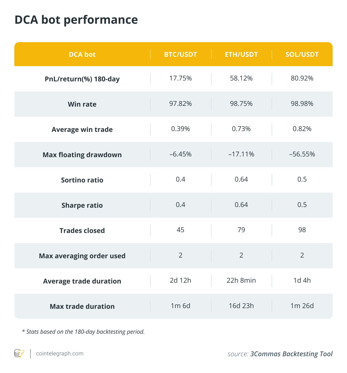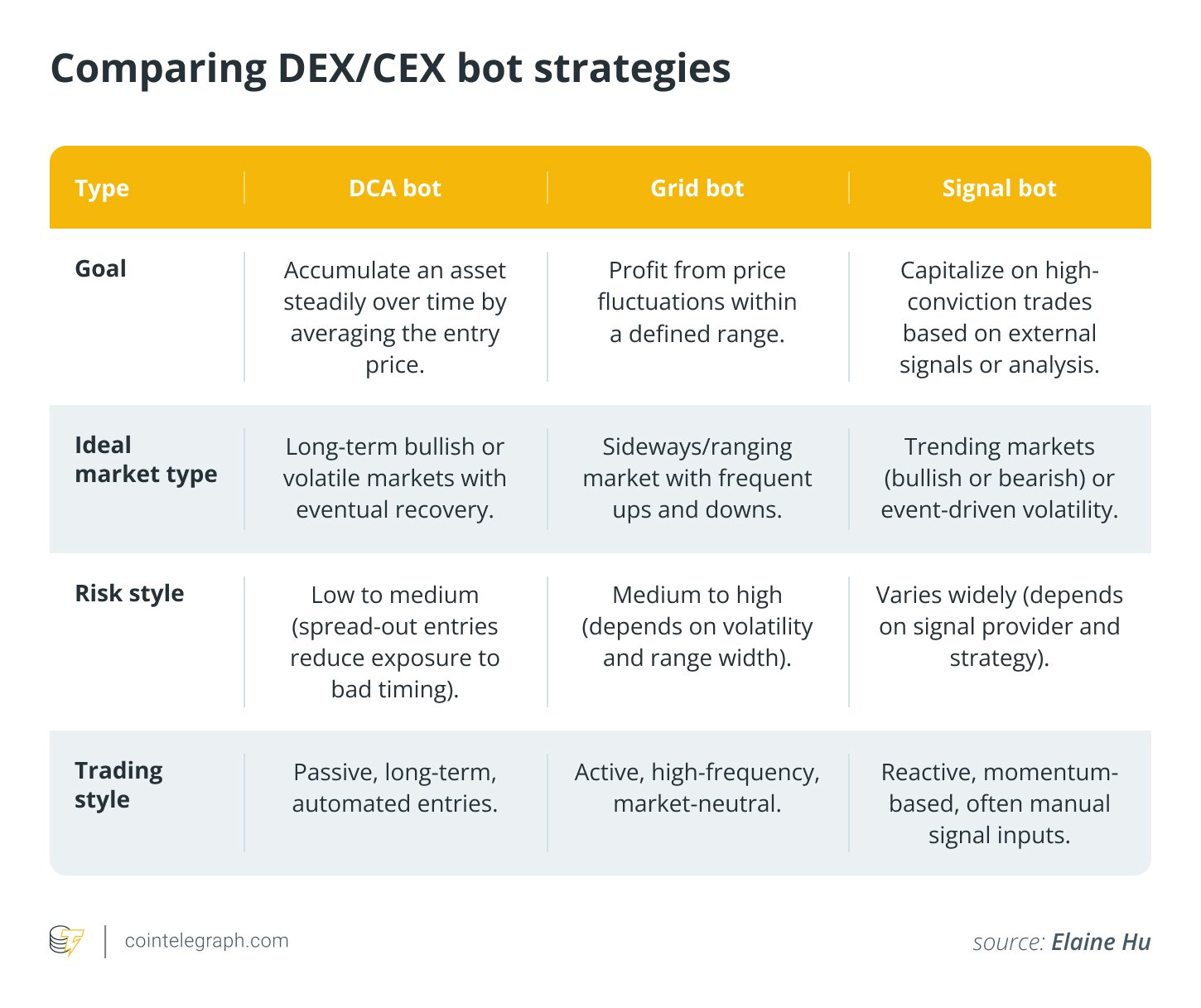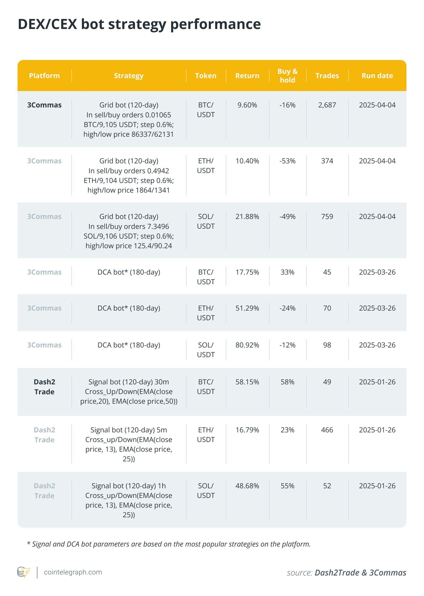 Cointelegraph has dissected historical bot revenues and token price rollercoasters and backtested strategy returns against the buy-and-hold yardstick to decode what bots shine brightest — and when — so you can pick the perfect bot to match your style and stomach for risk.