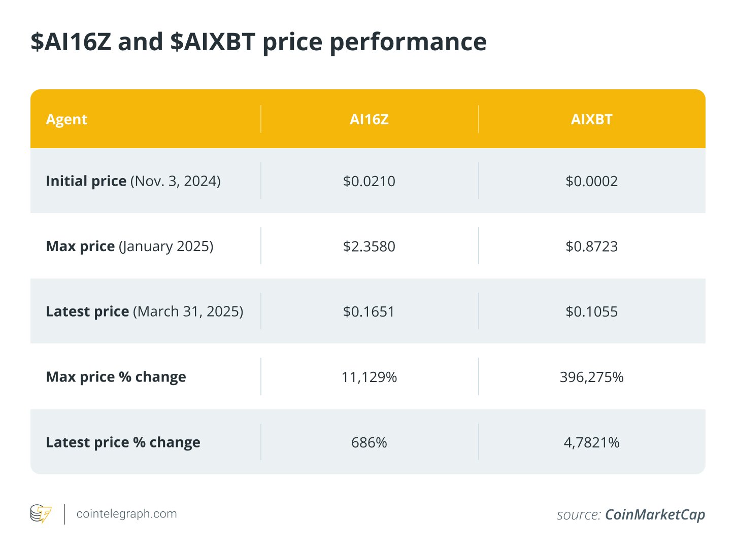 AIXBT’s price performance is more impressive than AI16Z. At the peak, the token price was almost 4,000x the initial price in November 2024, whereas for AI16Z, this was around 111x. Even after the recent downturn and the broader market trending down, the latest price record at the end of March 2025 is still 478x the initial price for AIXBT and 6.8x for AI16Z.