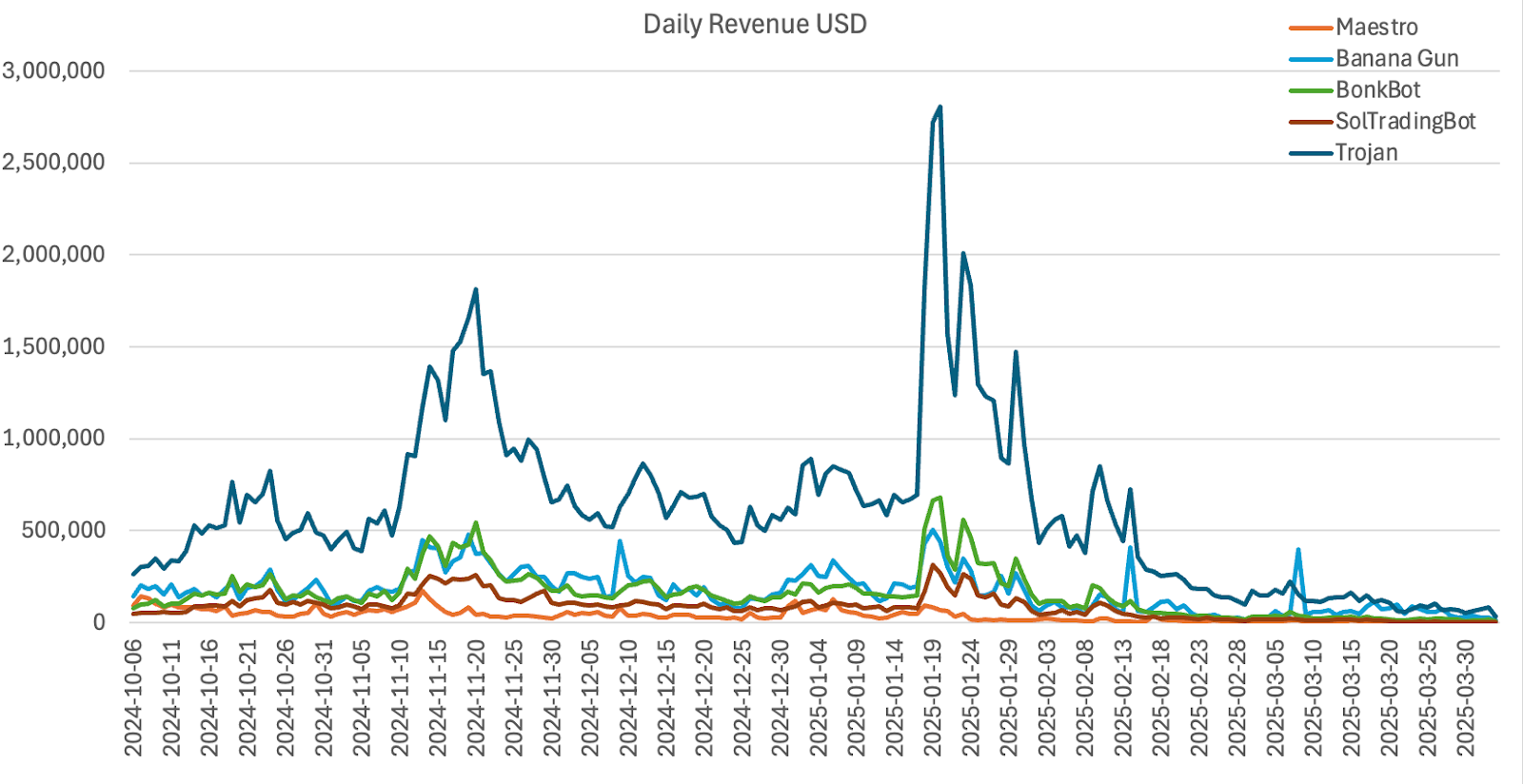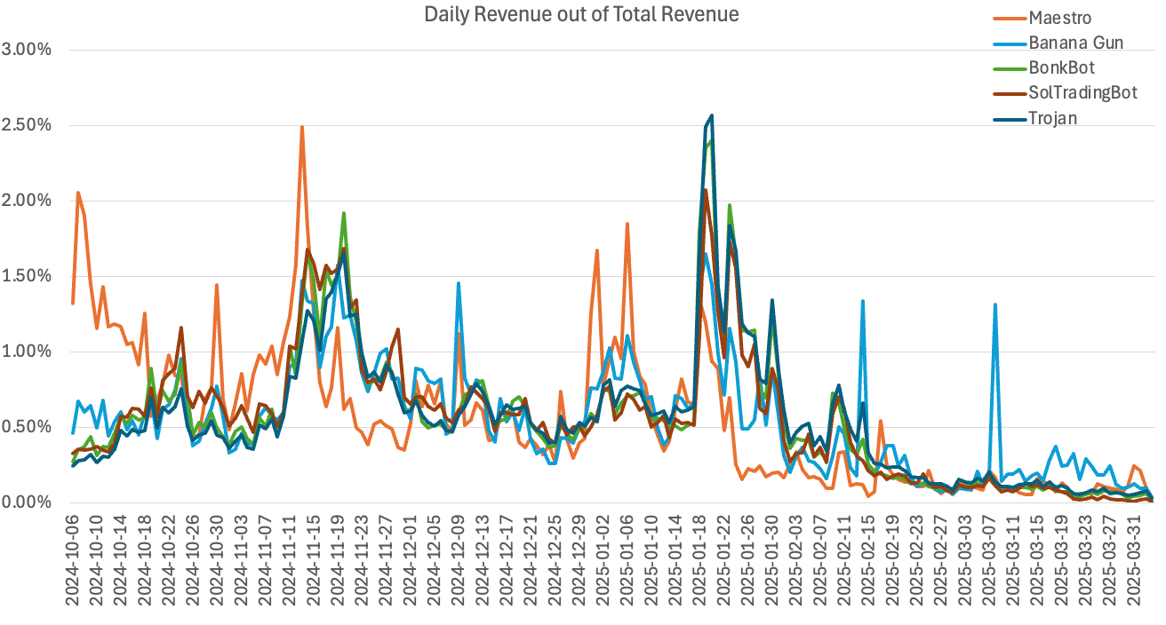 However, all bots saw revenue peak during the January 2025 memecoin hype and have since slowed due to bearish market sentiment. Token-linked bots (BANANA, BONK) followed a similar pattern — brief surges (notably BONK in November 2024) followed by steep drops tied to broader market trends.