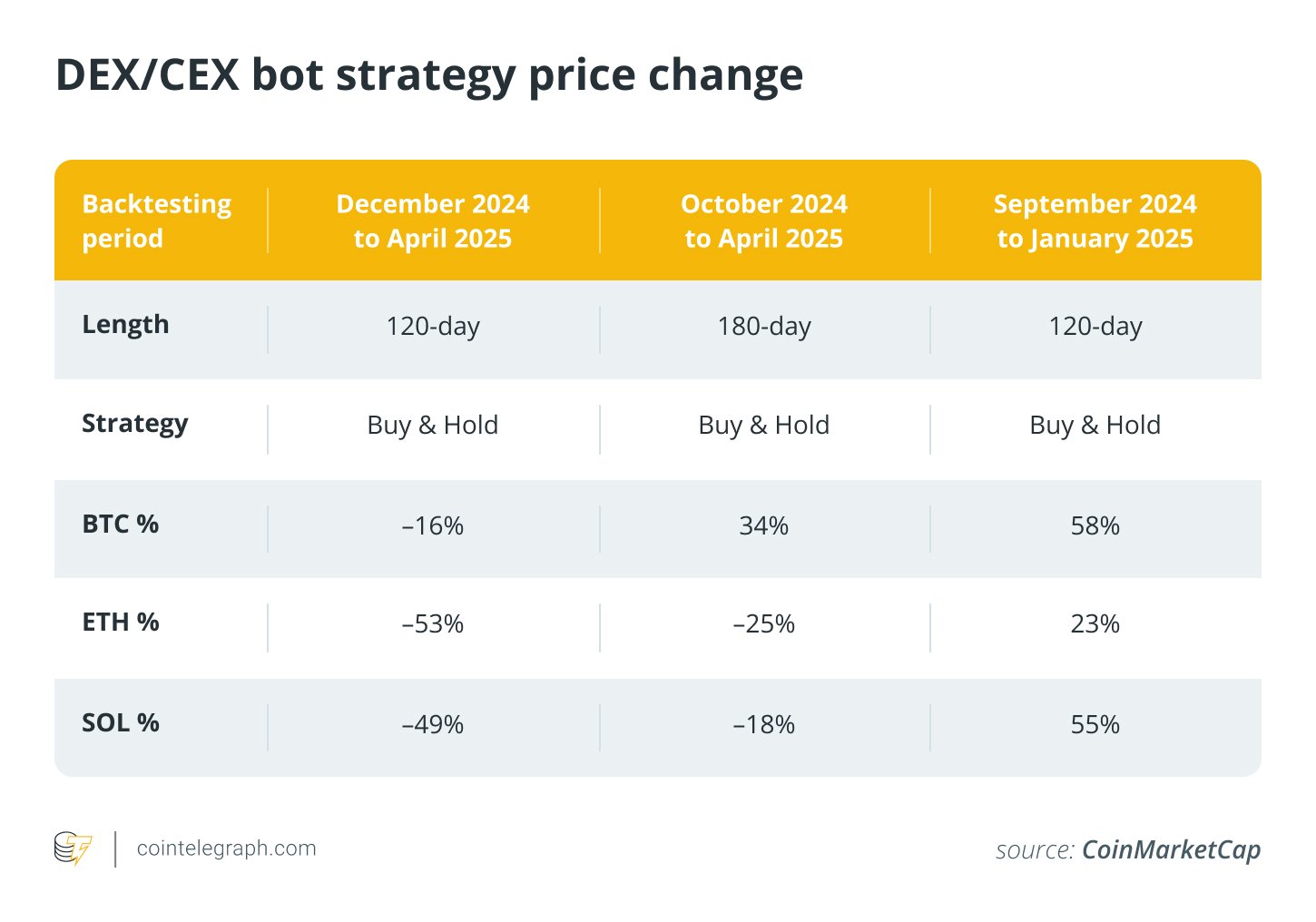 During the 120-day period from Sept. 26, 2024, to Jan. 26, 2025, when the signal bots were backtested, the market prices for Bitcoin (BTC), Ether (ETH) and Solana (SOL) were all upward trending with a buy-and-hold return of 58%, 23% and 55%, respectively. The signal bots’ strategies were performing in line with the buy-and-hold strategy (in some cases slightly worse) for BTC (58.15%), ETH (16.79%) and SOL (48.68%).