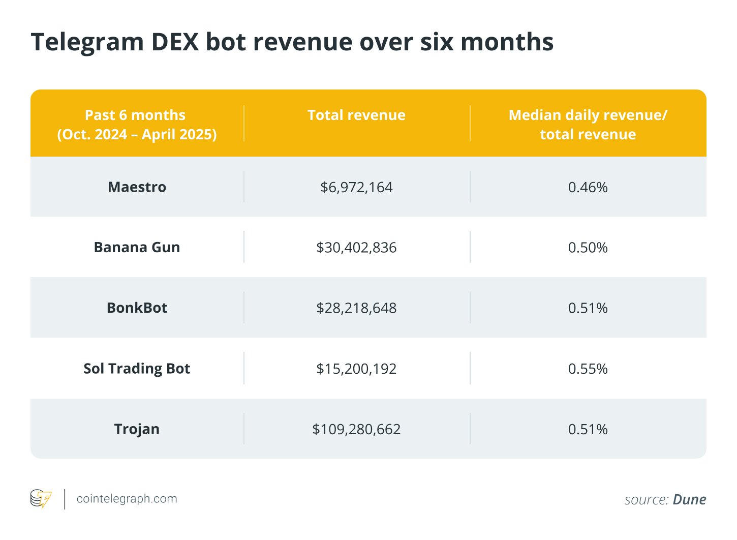Telegram DEX bots like Trojan and Sol Trading Bot dominated in revenue over the past six months, with Trojan earning about $109 million in fees. Sol Trading Bot stood out for consistent daily earnings relative to its size.