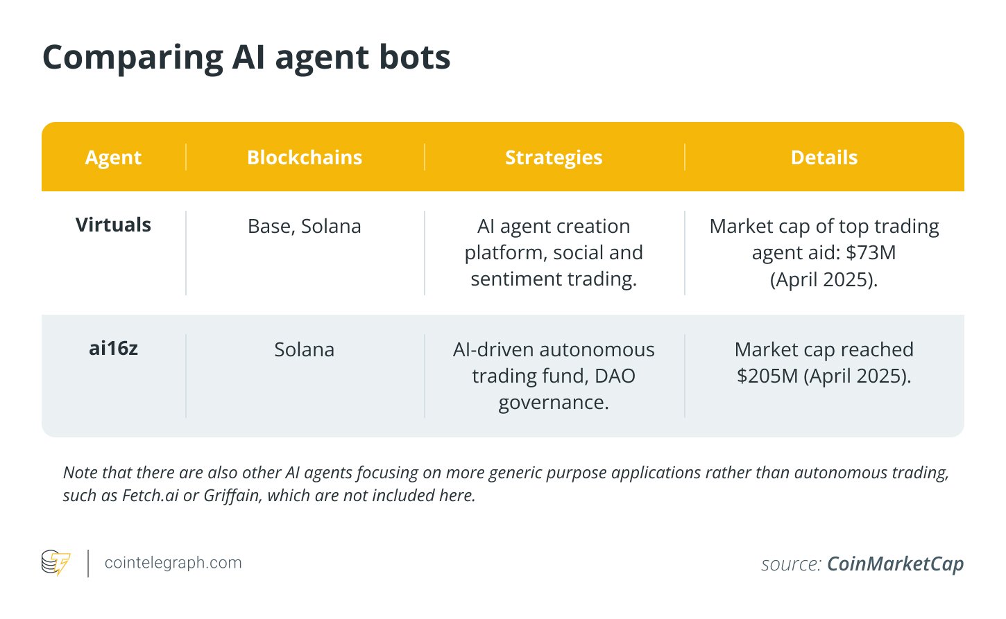 The term “agent” suggests these bots possess a degree of independence and decision-making capability that extends beyond the fixed rules of traditional automated trading systems. The most well-known AI agent frameworks that exist today are Virtuals and ai16z.