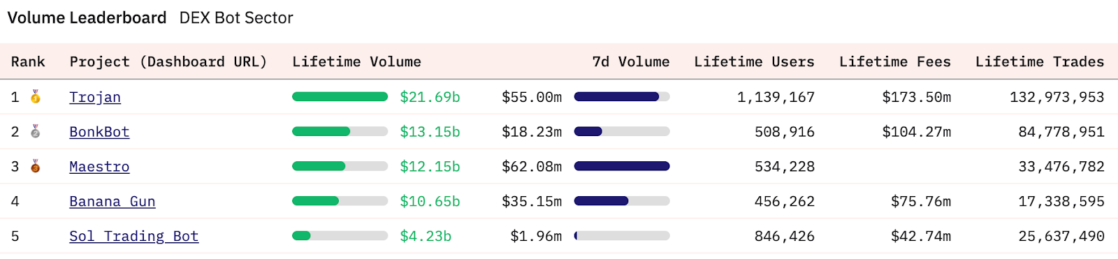 The top five Telegram bots by historical trading volume across all blockchains are Trojan, BonkBot, Maestro, Banana Gun and Sol Trading Bot. The majority of the trading volumes in the past 90 days happened on Solana, where all of the top five Telegram bots operate.