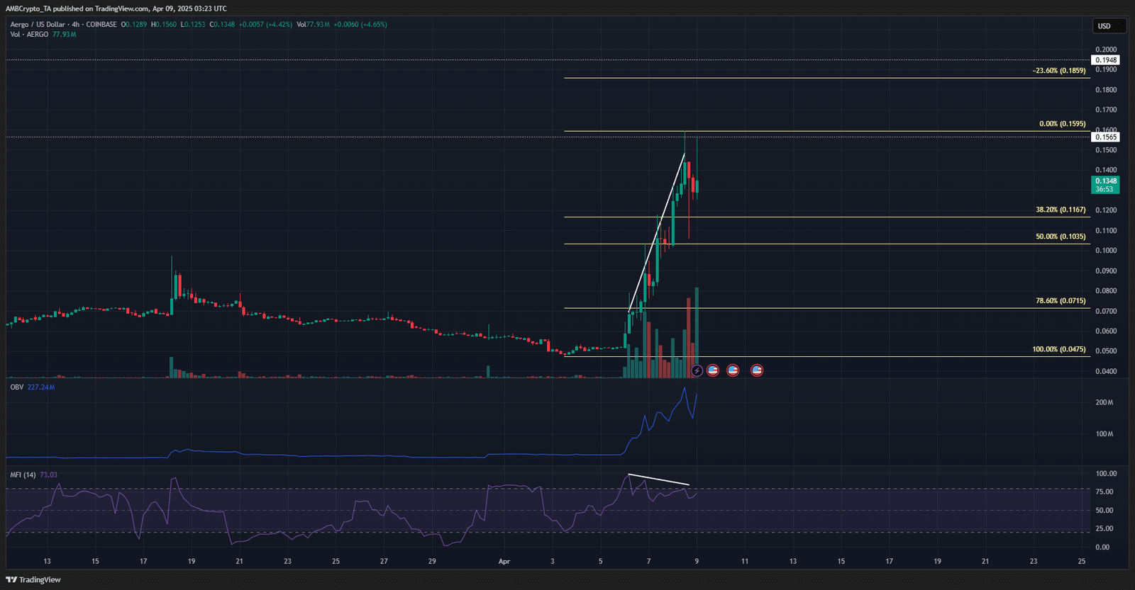 The 1-day chart revealed a bullish surge for the token, one that propelled it past the series of lower highs made since February. The session close above $0.08 on Sunday, 06 April, flipped the AERGO market structure bullishly on the 1-day chart.