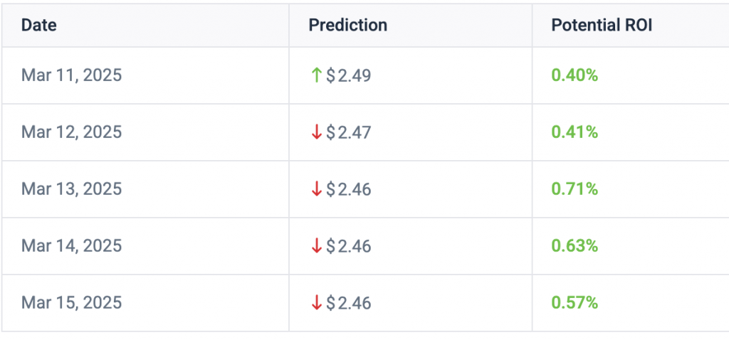 According to data from CoinCodex, XRP’s uptrend will witness a slight correction. Over the next couple of days, the asset is expected to see a downtrend. On March 15, XRP will trade at $2.46. This is certainly a dainty downfall from its current price. The rest of the month, however, could bring in major gains for the asset.