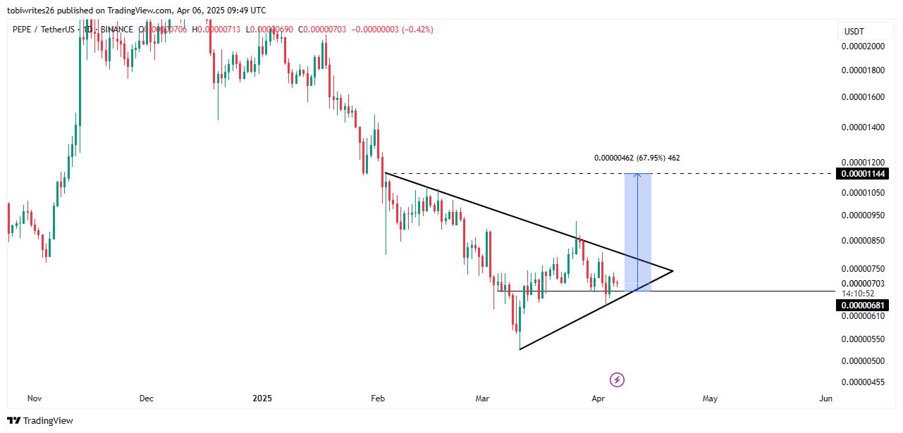 - PEPE has been trading within a symmetrical triangle pattern