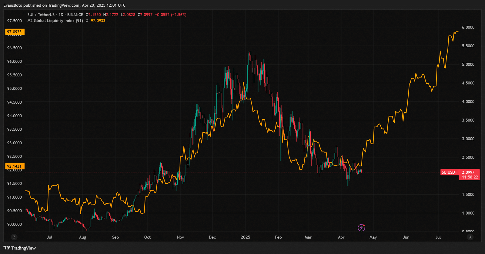 - SUI was trading at $2.11 at press time, despite rising M2 liquidity and strong on-chain growth