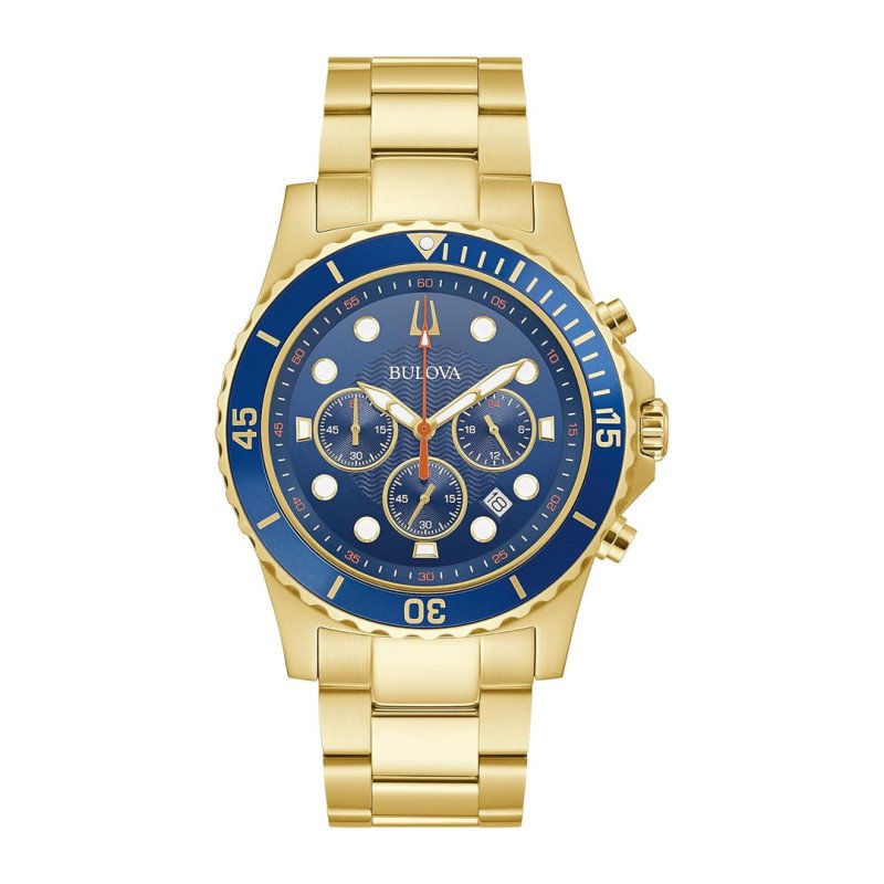 The Bulova Classic Sport Chronograph is the perfect combination of style and functionality. The 44-millimeter stainless steel watch has a beautiful gold tone with an eye-catching blue dial that adds a touch of color to any ensemble.