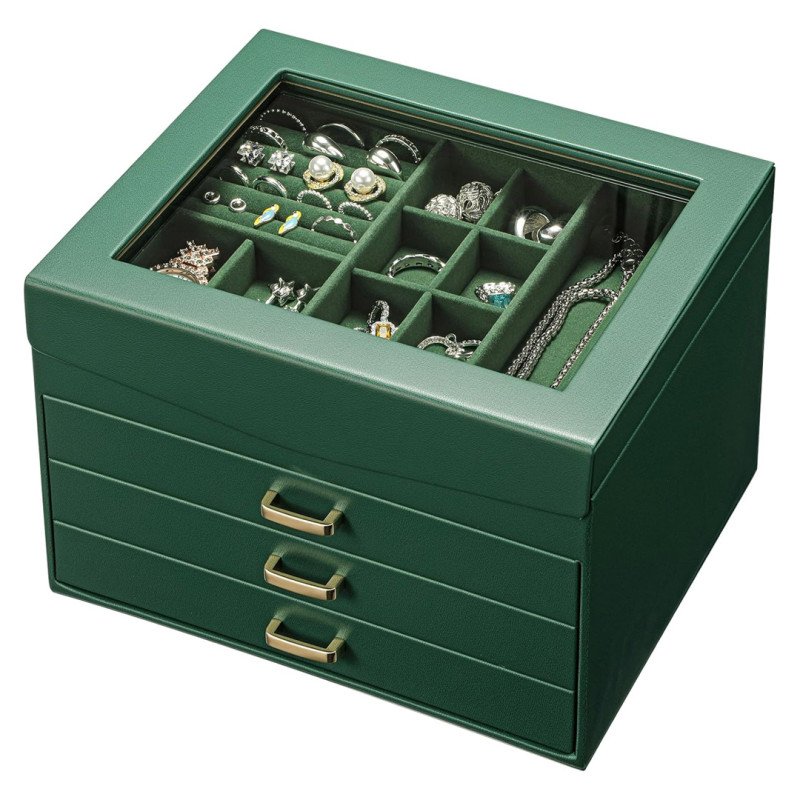 Outside of the useful nature of this jewelry box, it’s also quite attractive. The deep green vegan leather, accentuated with golden hardware on the drawer handles, will look elegant in any home. Inside, the organizer is covered in a soft, fuzzy material in a matching emerald color that’s gentle on delicate metals and gems.