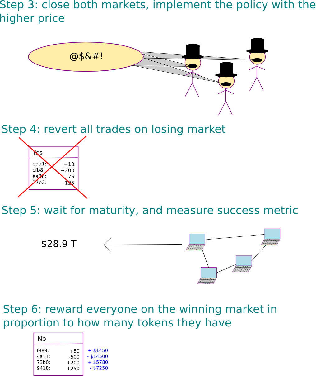 Suppose that the success metric chosen is GDP in trillions of dollars, with a time delay of ten years, and there exists a proposed policy: “bail out the banks”. Two assets are released, each of which promises to pay $1 per token per trillion dollars of GDP after ten years. The markets might be allowed to run for two weeks, during which the “yes” token fetches an average price of $24.94 (meaning that the market thinks that the GDP after ten years will be $24.94 trillion) and the “no” token fetches an average price of $26.20. The banks are not bailed out. All trades on the “yes” market are reverted, and after ten years everyone holding the asset on the “no” market gets $26.20 apiece.