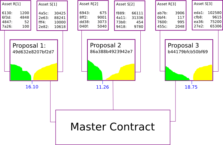 - The DAO generates n pairs of assets, R[i] and S[i], and randomly distributes the T units of each type of token in some fashion (eg. to miners, to DAO token holders, according to a formula itself determined through prior futarchy, etc). The DAO also provides n markets, where market M[i] allows trade between R[i] and S[i].