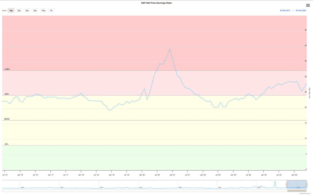 The current price-to-earnings (P/E) ratio of the S&P 500 is towards the higher end of where it has been over the last 10 years. And history tells us that returns from these levels are typically underwhelming.
