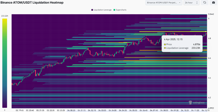 More analysis showed the heatmap from Binance revealed high concentration at the $4.87 level, accompanied by a liquidation leverage of $233.23K.