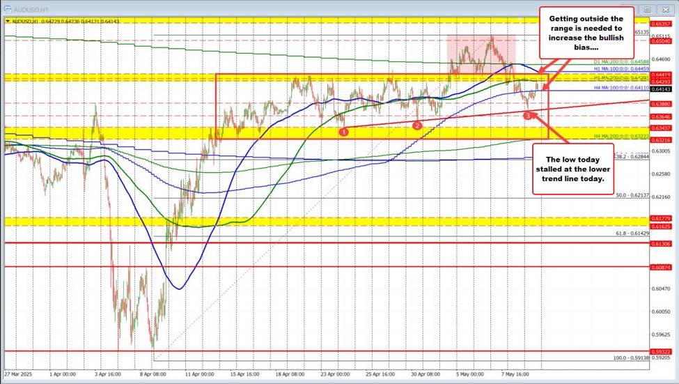 In today’s Asian session, buyers stepped in at a rising trendline support, helping to lift the pair back above the 100-bar moving average on the 4-hour chart. But gains were capped once again near the 200-hour MA at 0.64291.