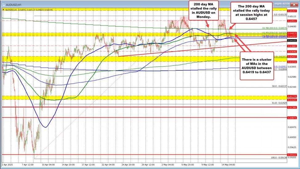 The AUDUSD continues to face strong resistance at the 200-day moving average, which capped rallies both on Monday and again today at the session high of 0.6457. Sellers leaned into that level, keeping upside momentum in check and maintaining the bearish pressure.