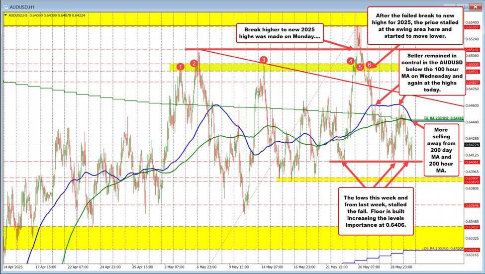 The AUDUSD started the week on a strong note, breaking above recent resistance to post a new high for 2025 on Monday. However, that bullish breakout proved short-lived. Price quickly reversed lower, falling back below the key swing area between 0.6493 and 0.6500 (see red numbered circles), and momentum accelerated as the pair broke below the 100-hour moving average (blue line).