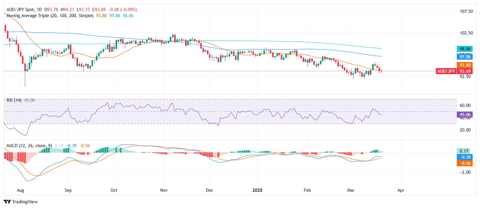 On Friday’s session the AUD/JPY edged slightly lower and was seen trading in the 93.70 area. The pair has now posted three straight sessions of mild declines, though it remains above a key support level. Price action shows some hesitation from sellers, as bulls attempt to defend the 20-day Simple Moving Average, hinting at a potential pause in downside pressure.