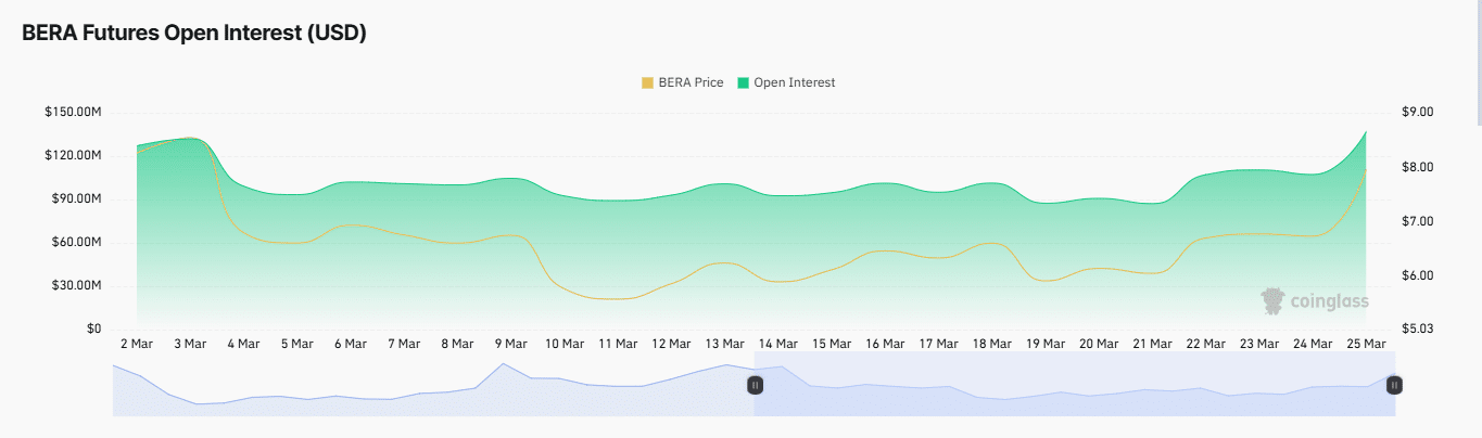 In the past 24 hours, BERA’s Open Interest has surged 202.2% to $136.79 million, signaling a notable increase in unsettled derivative contracts.
