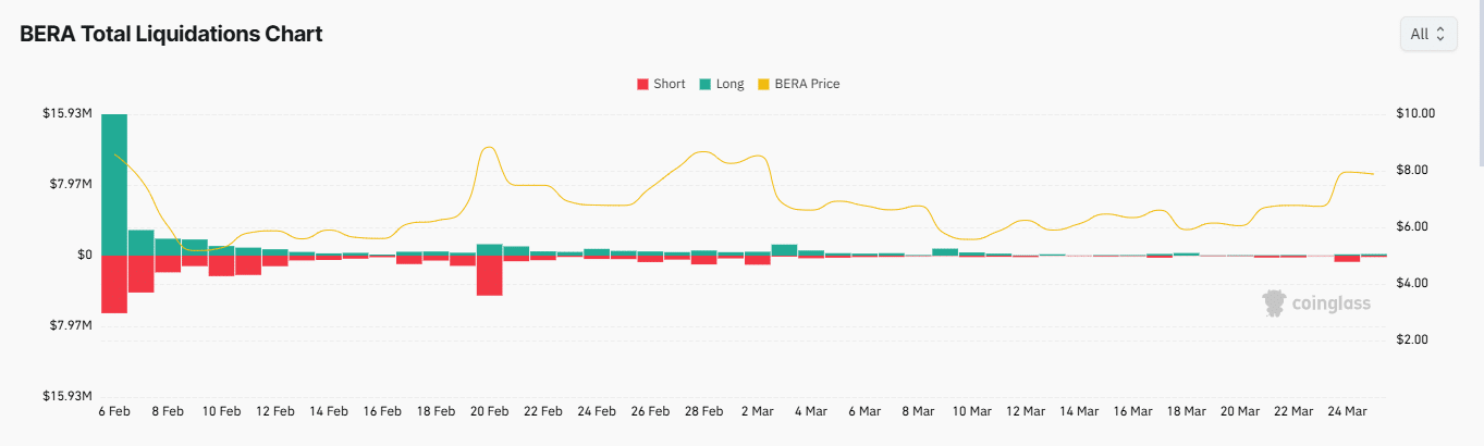 Meanwhile, short liquidations have increased, with traders betting against BERA losing $769,000 as the market moved against them.