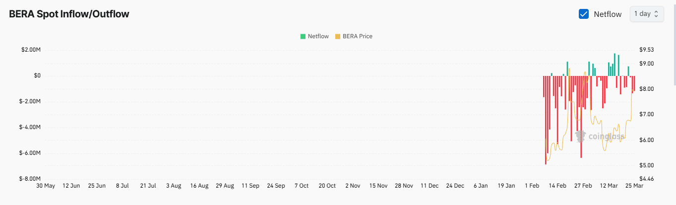 At the time of writing, spot traders have begun stepping in, purchasing $2.8 million worth of BERA in the past three days, as shown by exchange netflow data.