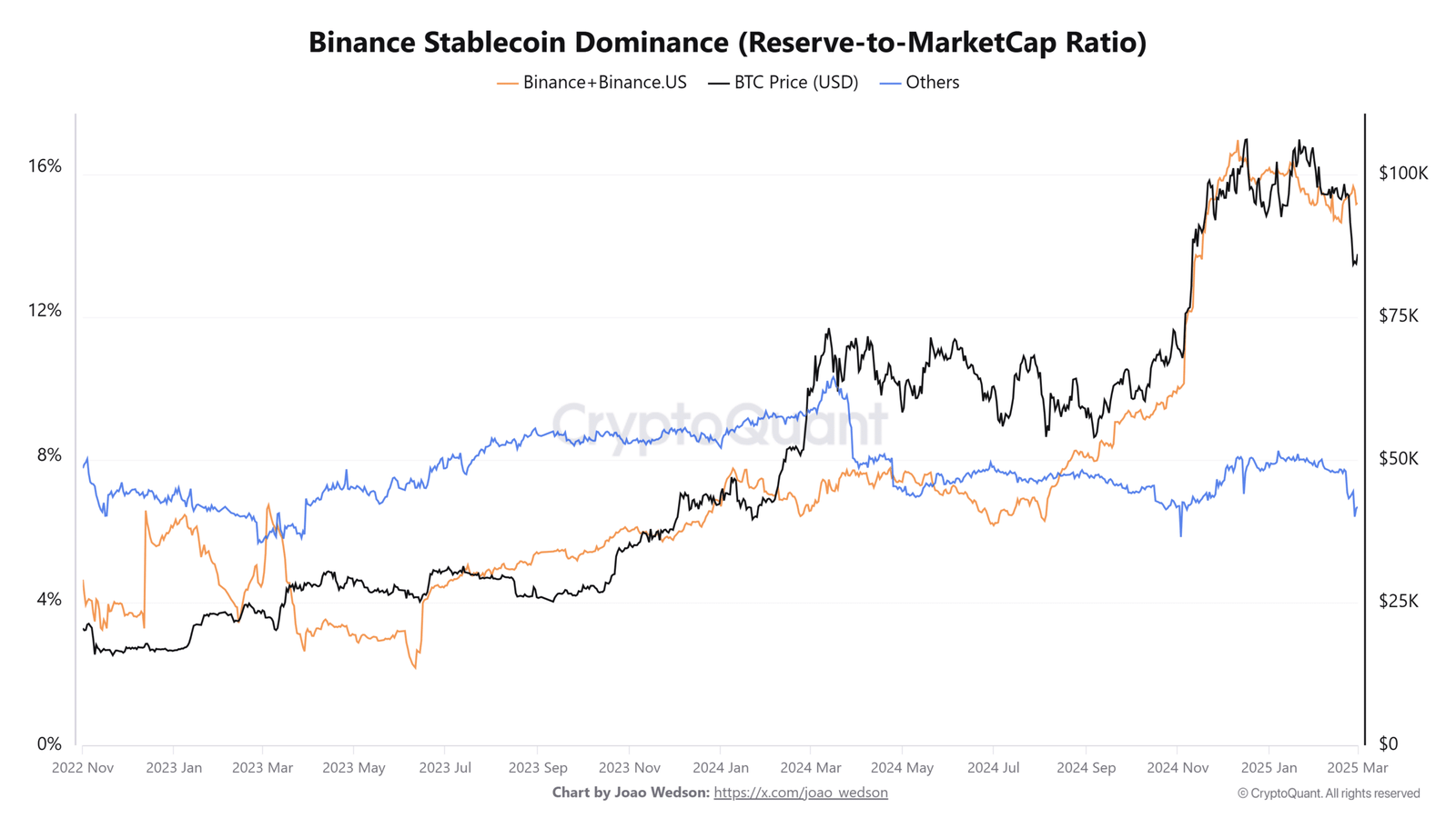 Binance’s stablecoin dominance relative to overall market cap reveals even sharper trends. At the start of 2024, the reserve-to-market cap ratio for Binance and Binance.US was around 8%.