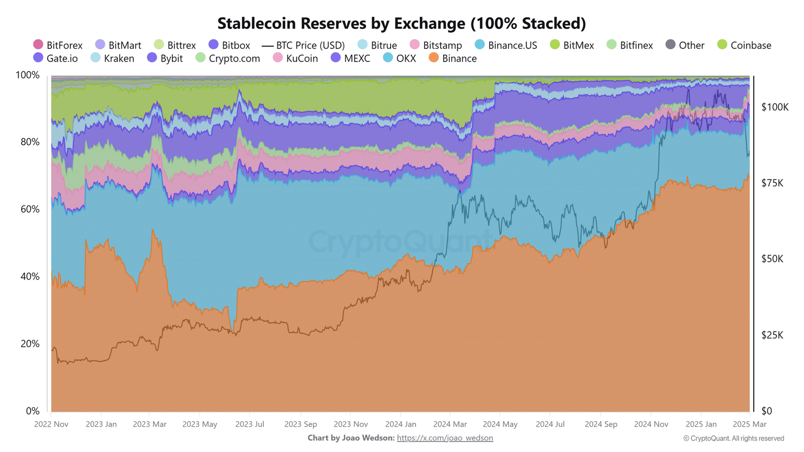 According to CryptoQuant’s 100% stacked chart of stablecoin reserves by exchange, Binance’s hold over the total reserve pie has visibly shrunk since January 2025.