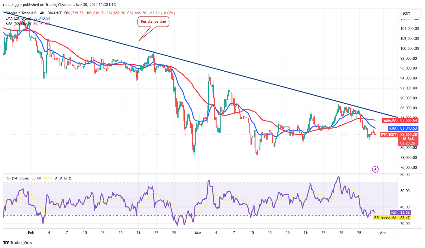 The 20-EMA has turned down on the 4-hour chart, and the RSI is in the negative territory, signaling that bears are in control. If the price turns down from the current level, the pair could slide to $80,000 and then to $78,000.