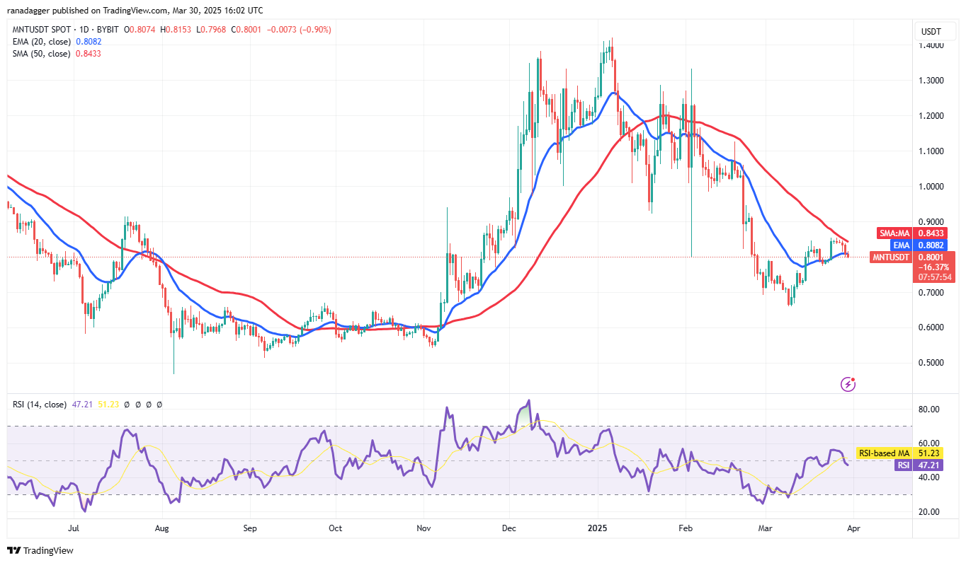 Mantle (MNT) failed to rise above the 50-day SMA ($0.84) in the past few days, but a positive sign is that the bulls are trying to hold the price above the 20-day EMA ($0.80).