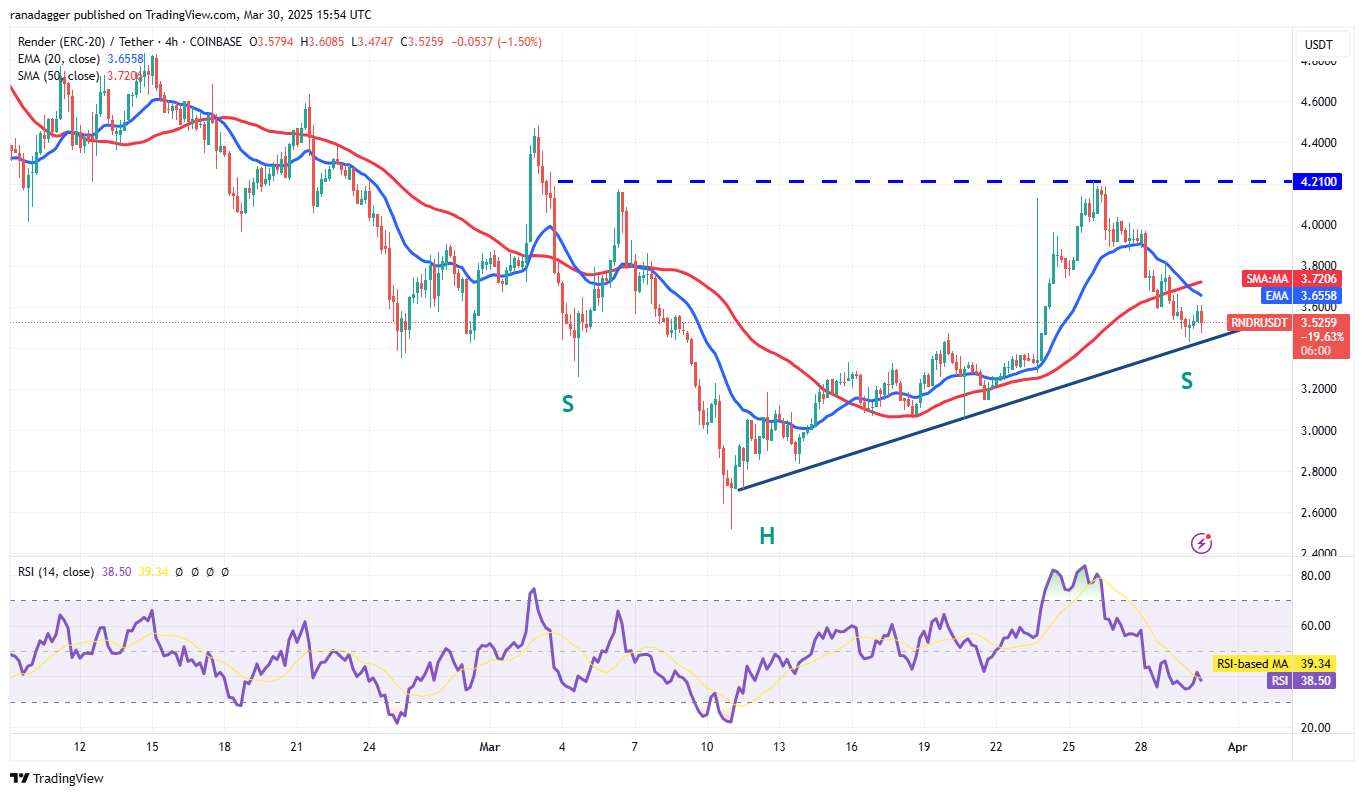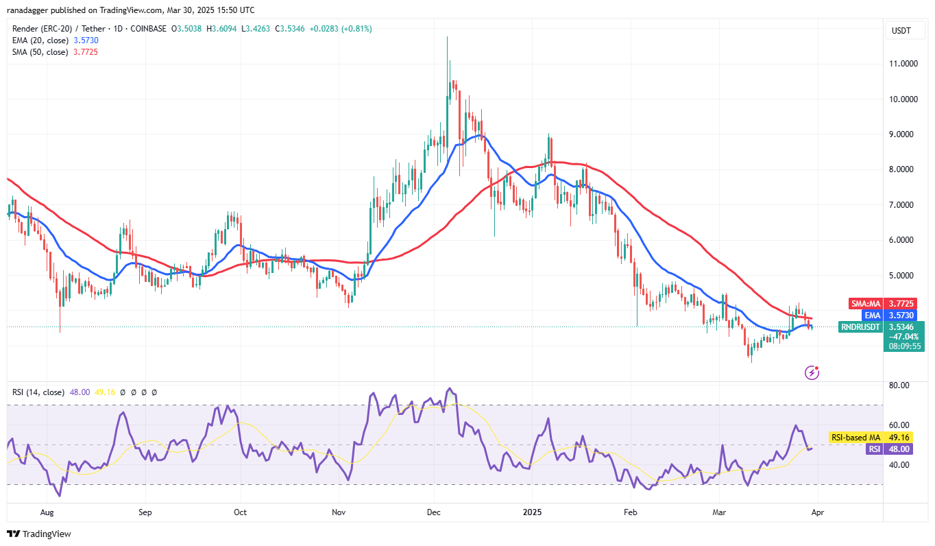 Render (RNDR) has been in a strong downtrend for several weeks, but the bulls pushed the price above the 50-day SMA ($3.77) on March 25, signaling demand at lower levels.