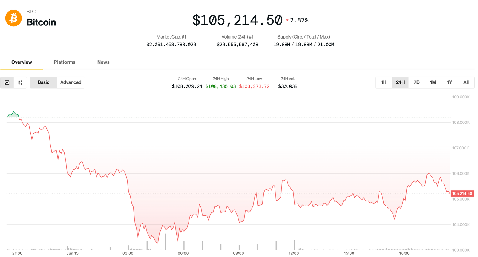 rebounded to around $106,000 before fading lower in the U.S. afternoon hours with reports about a fresh wave of airstrikes targeting Iran. The top cryptocurrency was down 1.6% in the last 24 hours, changing hands at $105,200 and still less than 6% shy of its all-time high price.