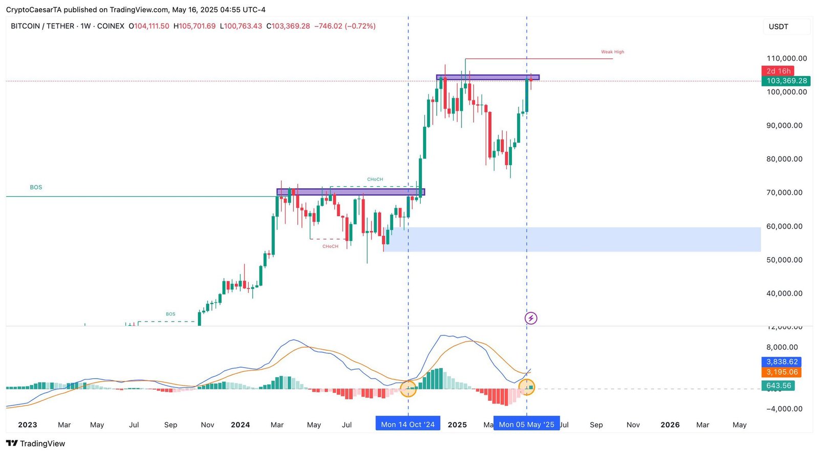 “If price breaks and holds above this zone, we could see new crazy highs,” he told X followers, referencing a bullish crossover on the weekly moving average convergence/divergence (MACD) indicator.