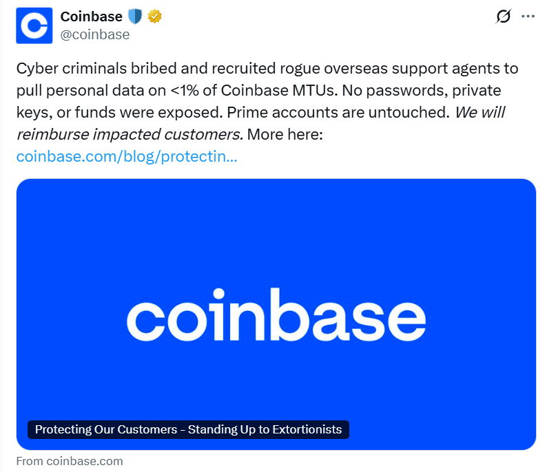 News broke on May 15 that Coinbase was the target of a $20 million extortion attempt after cybercriminals recruited overseas support agents to leak user data for social engineering scams.