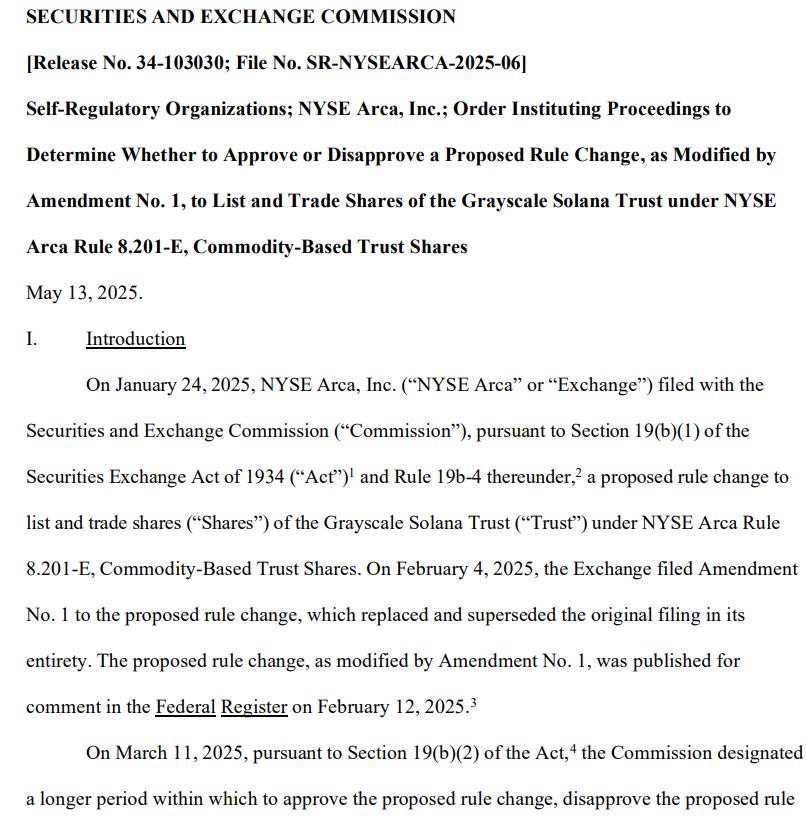 The SEC delayed its decision on listing Grayscale’s spot Solana (SOL) Trust ETF on the New York Stock Exchange (NYSE) to October 2025, according to a May 13 filing by the securities regulator.