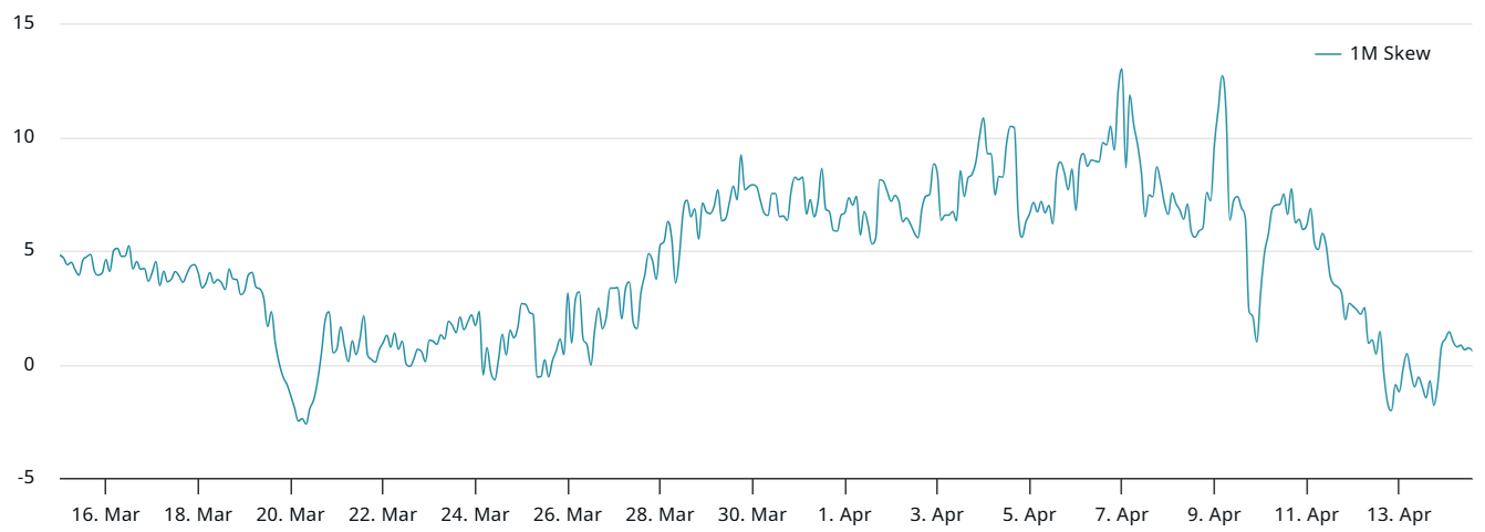 On April 13, the Bitcoin options delta skew briefly dipped below 0%, signaling mild optimism. However, this momentum did not hold on April 14, reinforcing data from Bitcoin futures that show no significant bullish sentiment despite prices recovering from the $74,440 lows.