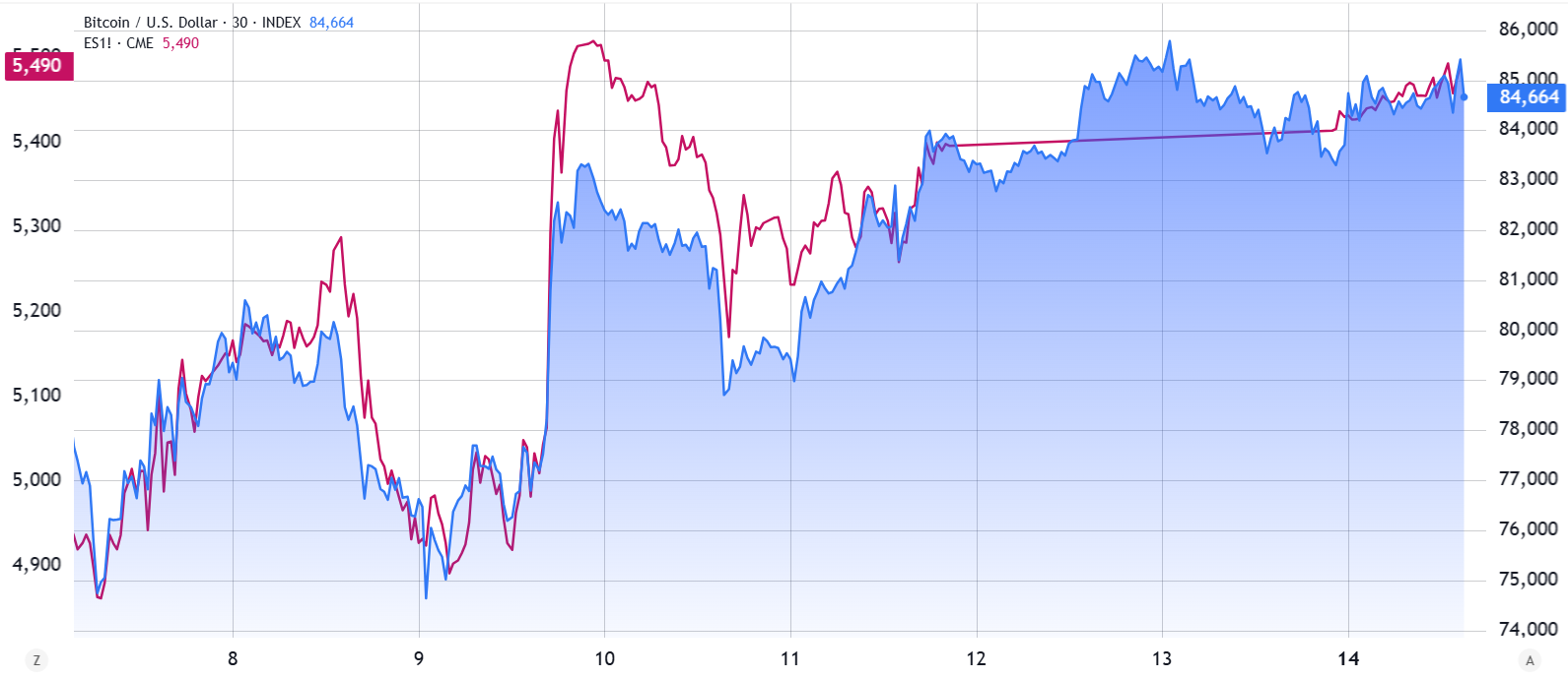 S&P 500 futures (left) vs. Bitcoin/USD (right). Source: TradingView / Cointelegraph