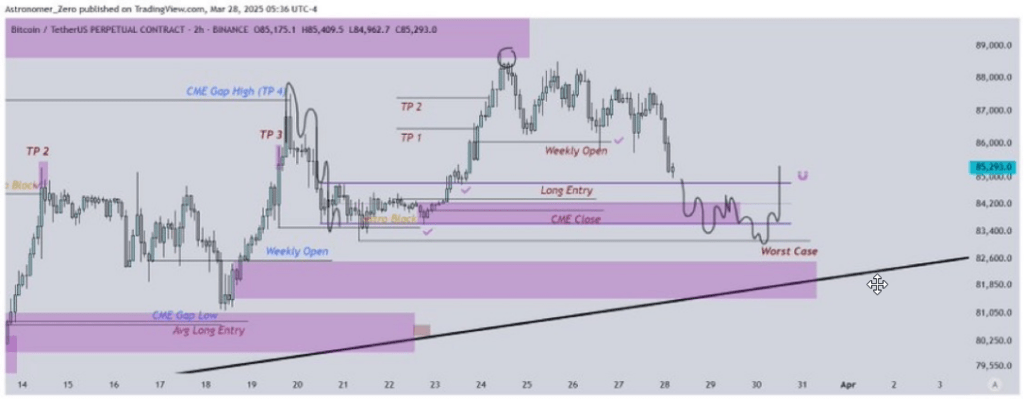 The analyst predicts that if Bitcoin can successfully hold the CME gap close, a bounce toward the weekly open price at $86,000 could be its first step toward a much-anticipated recovery. Beyond this, the analyst has pinpointed key take profit levels marked from TP1 – TP4 on the price chart. These levels suggest that Bitcoin could surge higher to reach a target of $87,000 – $88,000.