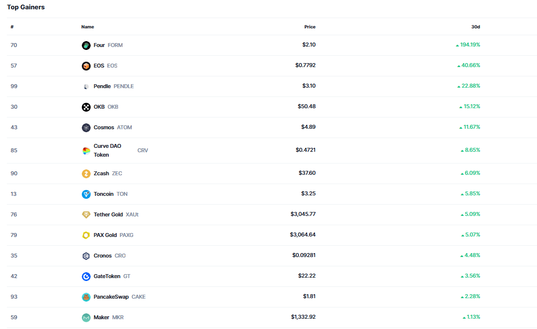 Topping the leaderboard is Four [FORM], a low-cap asset that has posted a 194.19% rally to $2.10, signaling heightened speculative interest and liquidity influx.